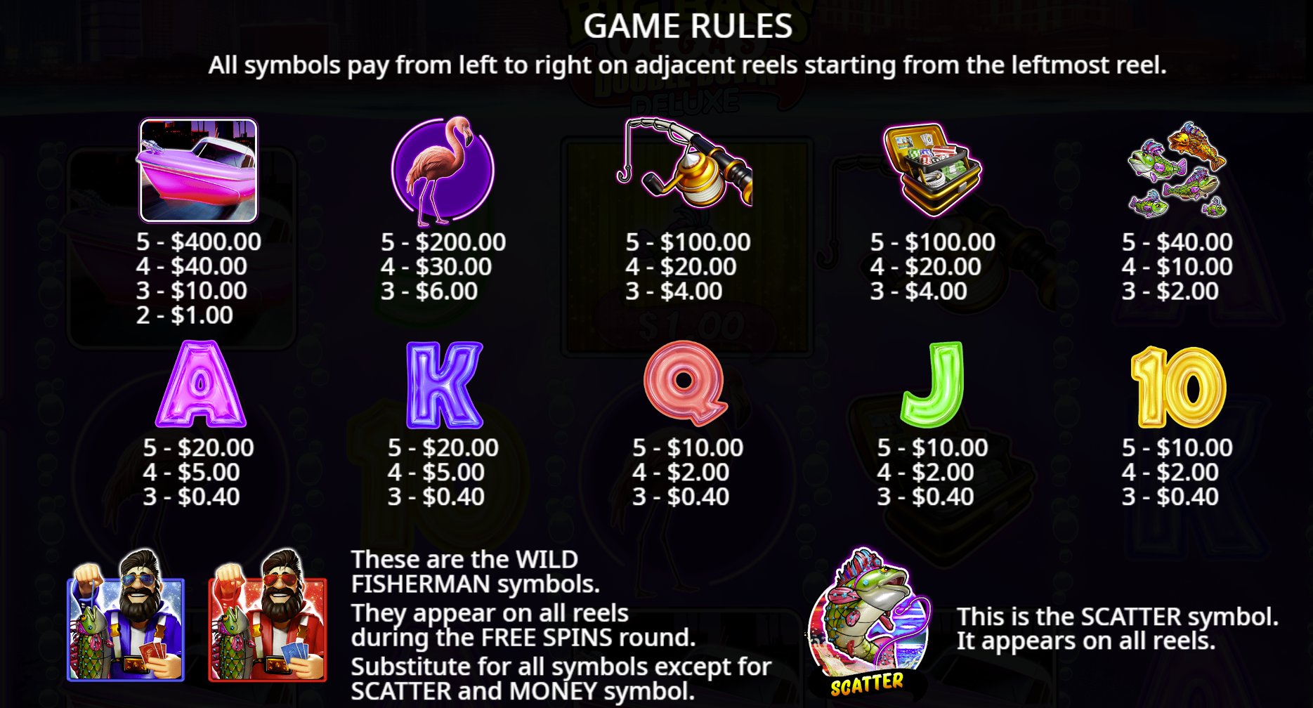 The mix of fishing-themed symbols with Vegas-style neon visuals gives the slot a vivid, energetic vibe: its flashy yet relatable for fans of classic slot mechanics. The addition of modern bonus mechanics (money symbols, wild-collector, retriggers) adds enough depth to keep things interesting. :contentReference[oaicite:14]{index=14}